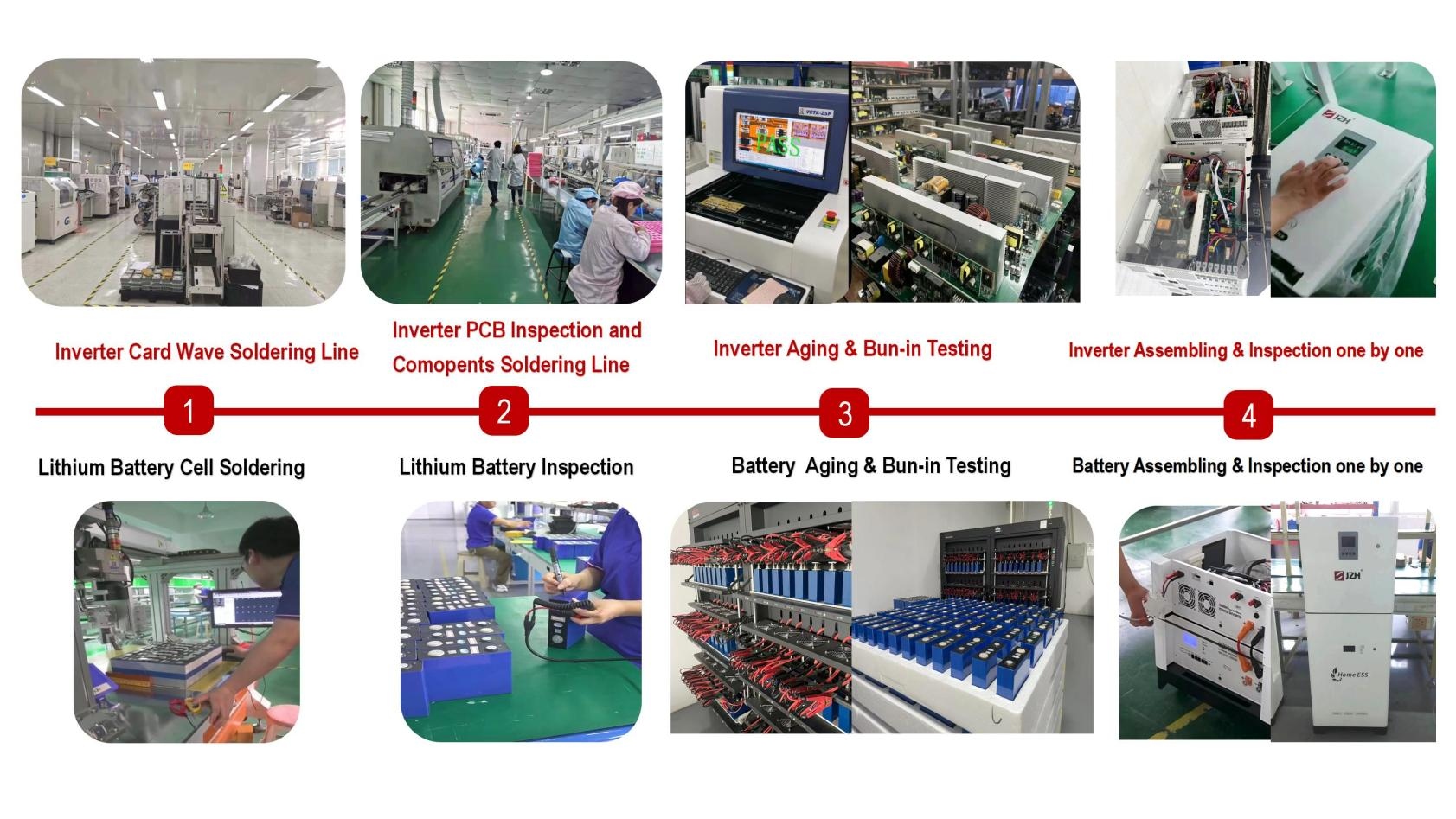 Pwodiksyon DPT. : Pwodiksyon nou an DPT travay anba orè lòd, nou gen 3 liy pwodiksyon otomatik ak plis pase 80 travayè yo. Pwodiksyon nou an se sitou pwodwi pa liy pwodiksyon otomatik, pou PCB varyateur nan BMS la / PCS / EMS se totalman pwodwi pa liy machin vag nou an soude otomatikman, epi tou li pake a batri ityòm se soude pa machin otomatikman. Tout pwodwi a pwodwi ak teste youn pa youn ak ekip strik nou an kontwole bon jan kalite.